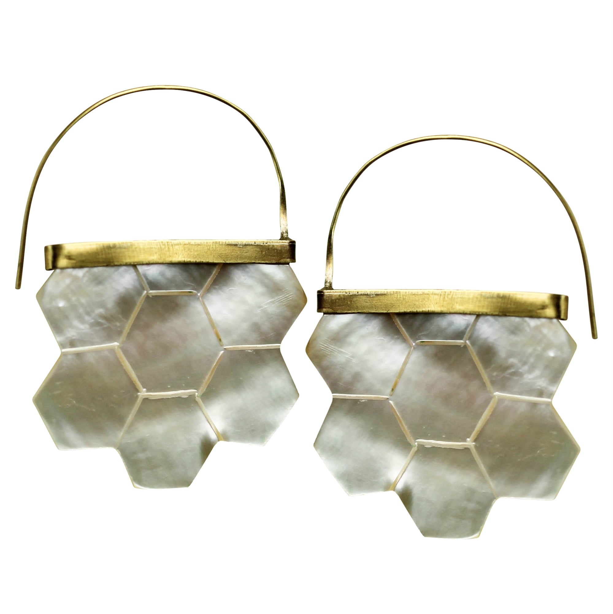 The luster in Mother of Pearl is further enhanced with an etched honeycomb pattern, catching the light, creating a dazzling earring that goes from casual to dressy. brass and shell...