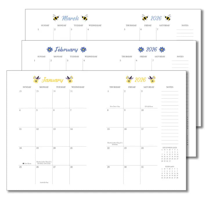 Full-month overview grids & full-week calendar spreads • Additional notes pages • 2025 and 2026 year-at-a-glance grids • Goal setting and project planning pages included! • Holidays & moon phases noted • Printed with soy-based ink on FSC paper